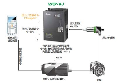 油壓驅(qū)動技術是目前射出成型機使用最廣泛的驅(qū)動控制方式,具有功率重量比大、壓力和流量控制佳、壽命長及易維護等優(yōu)點;而交流伺服馬達驅(qū)動技術則具有響應快、精度高、恒轉矩等優(yōu)點。臺達VFD-VJ系列油電伺服驅(qū)動器利用交流伺服馬達驅(qū)動的油壓系統(tǒng),將伺服驅(qū)動技術、馬達技術與油壓技術結合,且以精確的壓力與流量控制,消除高壓節(jié)流的能源損耗,將射出成型機油壓驅(qū)動技術再度創(chuàng)新。此外,臺達在倡導綠色設計的理念及領先的環(huán)保技術上,亦提升了產(chǎn)品綠色制造的技術水平,為客戶創(chuàng)造更多價值。